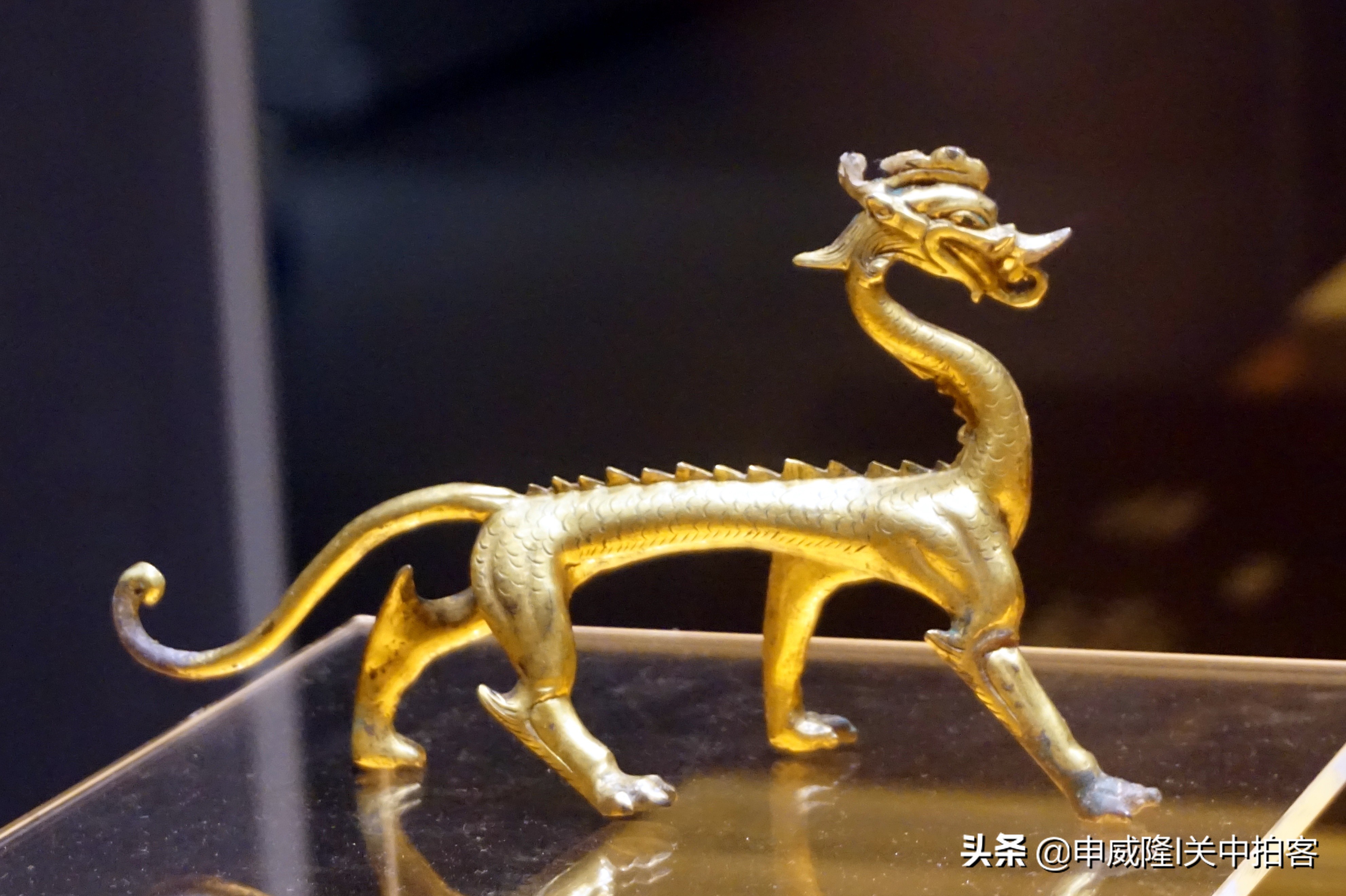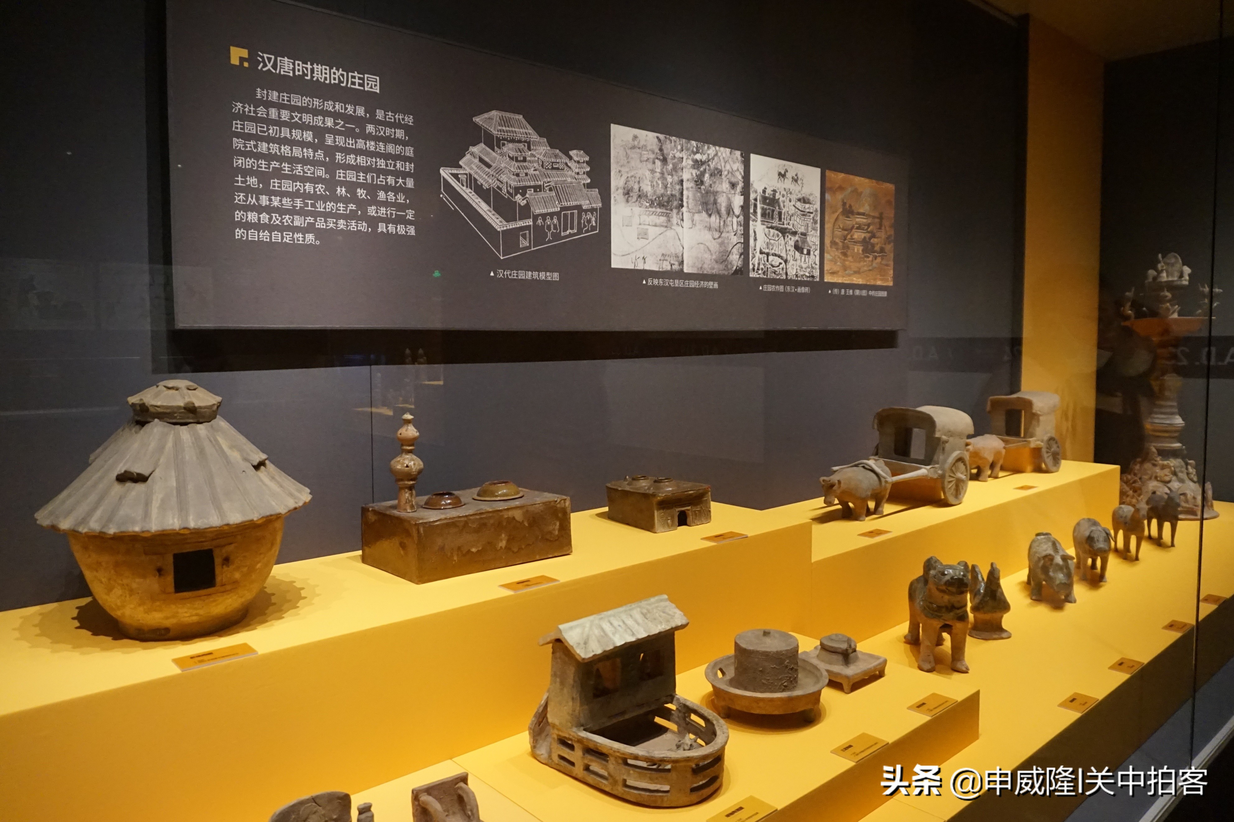 这里迎面是一件唐代鎏金走龙,展现出一种朝气蓬勃的生命力,筋骨强劲,健硕有力,昂首挺胸,大步向前。旁边展柜的陶质冥器展示了汉唐时期的庄园经济,包括粮仓、猪圈、牛车、动物等。