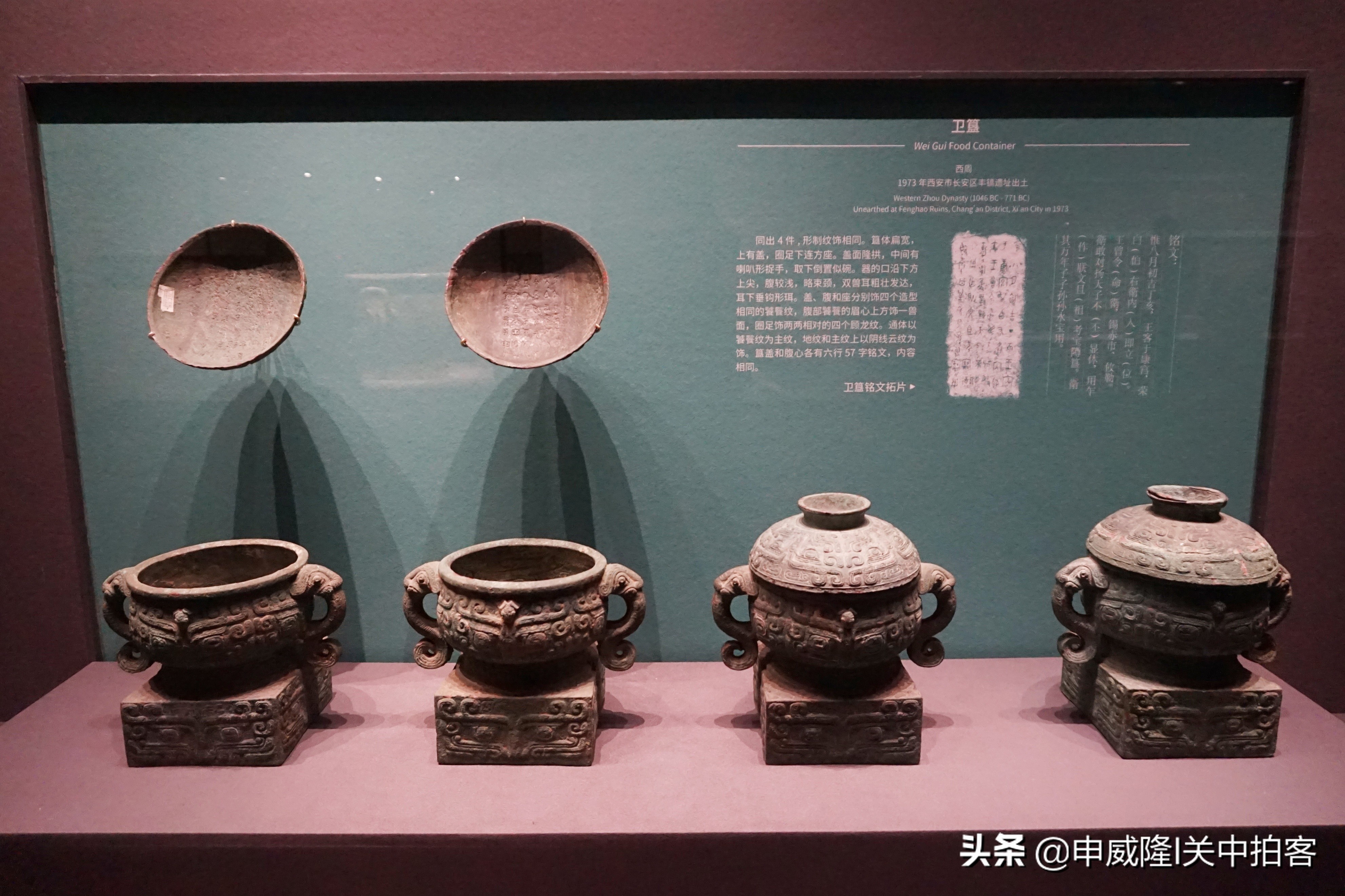 这里陈列的四件卫簋的形制和纹饰完全相同,器物的盖子和腹内的底部均铸有相同的57字铭文,记述周天子在康宫召见并赏赐给卫赤巿和攸勒之事。1973年,这套卫簋出土于西安市长安区马王村。