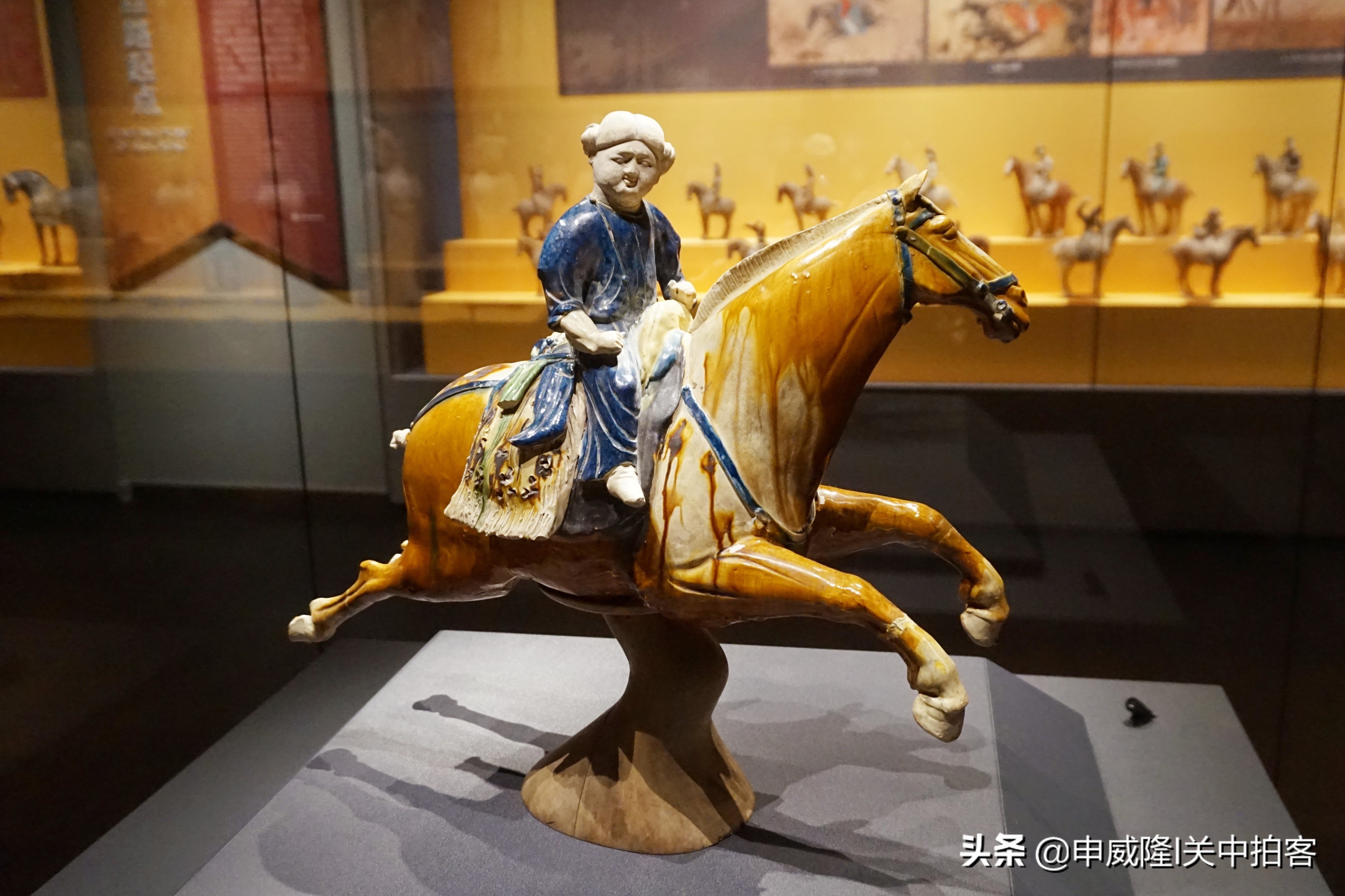 这里陈列的唐三彩腾空马被誉为西安博物院的“镇馆之宝”之一。1966年,这件唐三彩出土于西安市莲湖区制药厂唐墓内,由胡人少年骑手和飞奔而起的悍马两部分组成。它以生动逼真的造型和光亮夺目的釉色,表现出骑手淡定自然和骏马疾驰的瞬间姿态,好像一位怀揣梦想来到大唐长安城的年轻人。