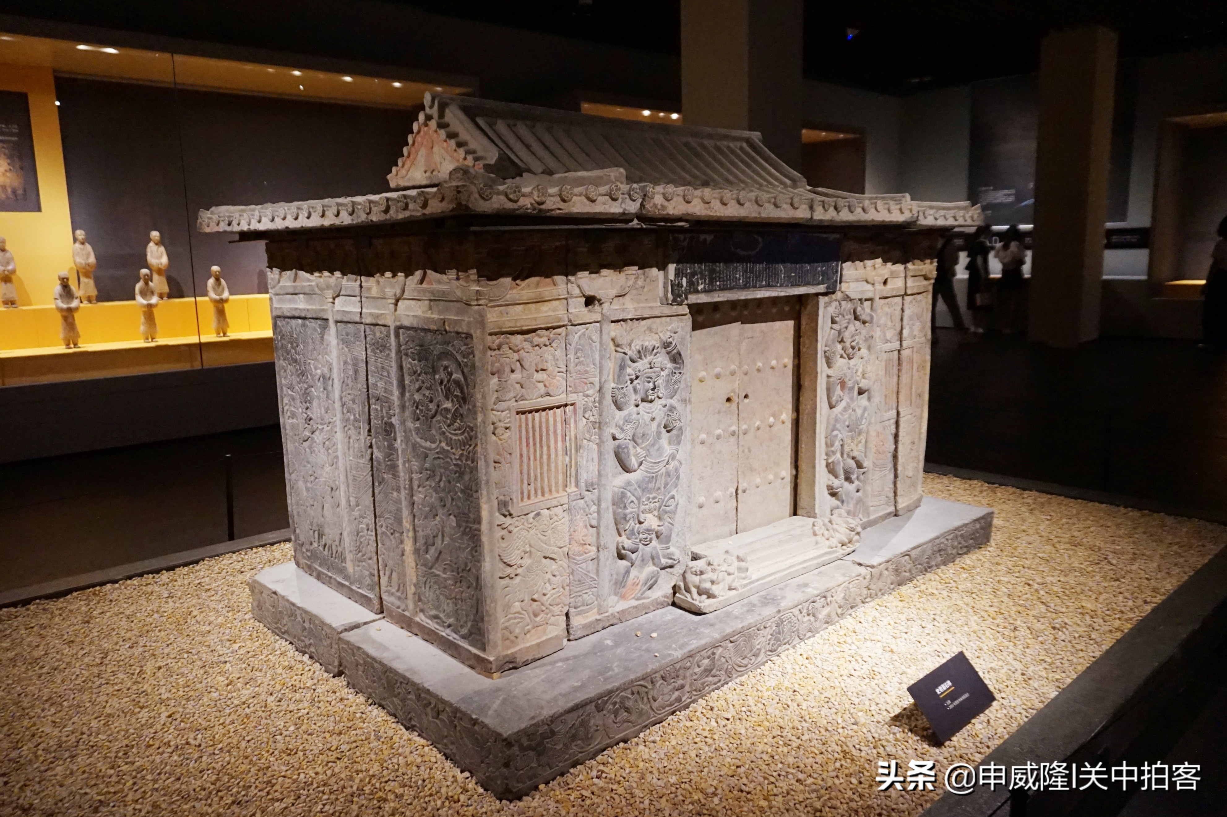 在展厅的中间,摆放着北周时期的史君墓石椁,外观好像一座雕梁画栋的歇山顶房屋。2003年,这件石椁出土于西安市未央区大明宫乡井上村,表面采用浮雕彩绘贴金装饰,图像内容涉及粟特人的袄教。墓主人史君为北周凉州萨保,相当于粟特人的商队首领,处理民族内部事务,接待中央政府官员。