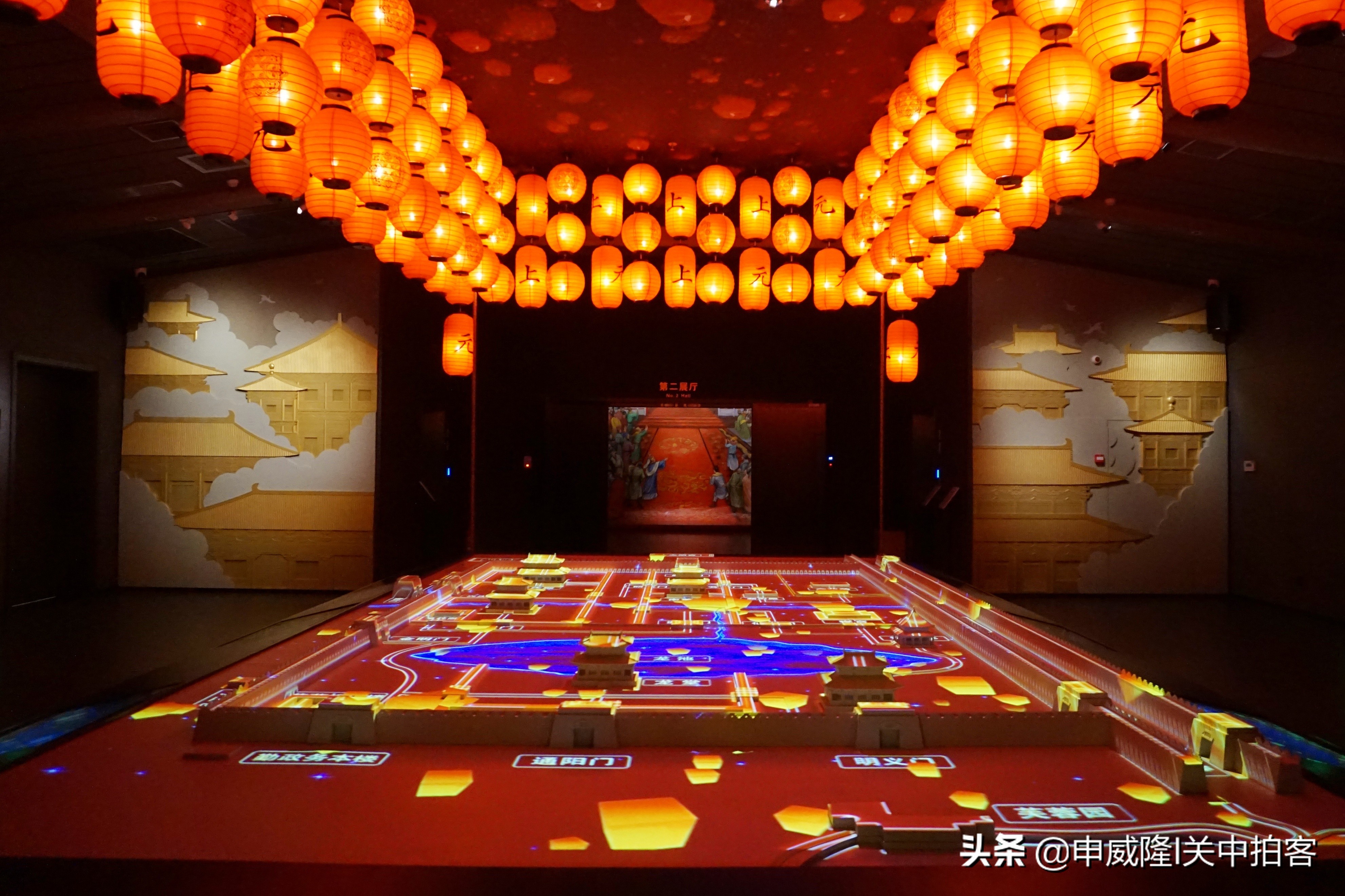 沿着回廊,继续向前,走进南侧的第二个展厅内,眼前的景象令人叹为观止。在展厅中间,摆放着唐代兴庆宫复原模型,灯光照射之下,显得色彩斑斓。抬头朝上方看去,挂满火红的灯笼,表面写着“上元”二字,让人仿佛置身于唐朝热闹的上元佳节之夜。