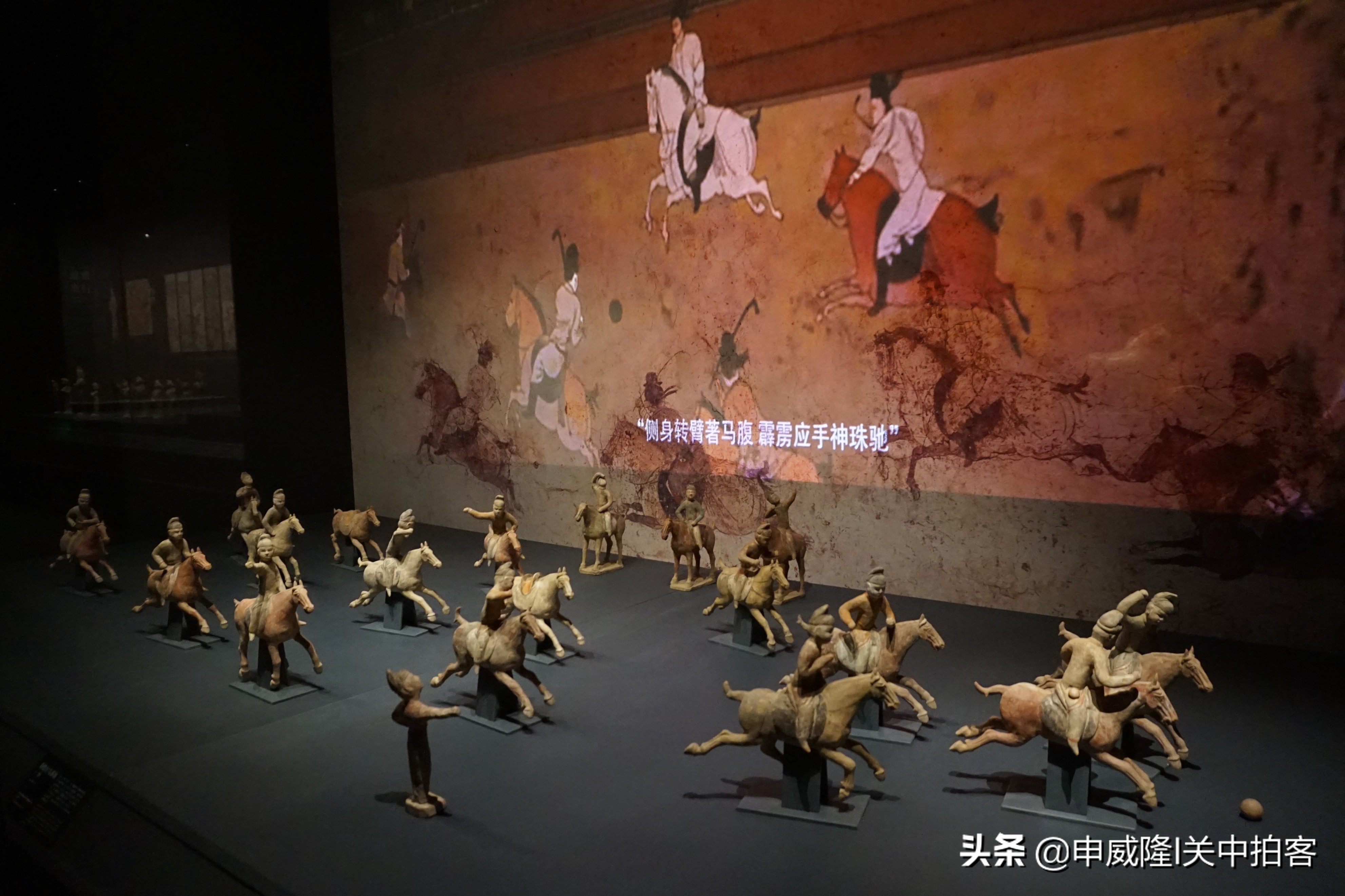 这里可以看到大量的马俑,反映了唐朝人爱马的风气,也体现了大唐盛世激扬饱满的风貌。这些马的造型生动多样,或站立,或行走,或嘶鸣,或奔跑,有的回首观望,有的低头伸颈。其中,有一组打马球俑,再现了唐代马球运动的激烈场景,跟乾陵章怀太子墓出土的《打马球图》相互辉映。