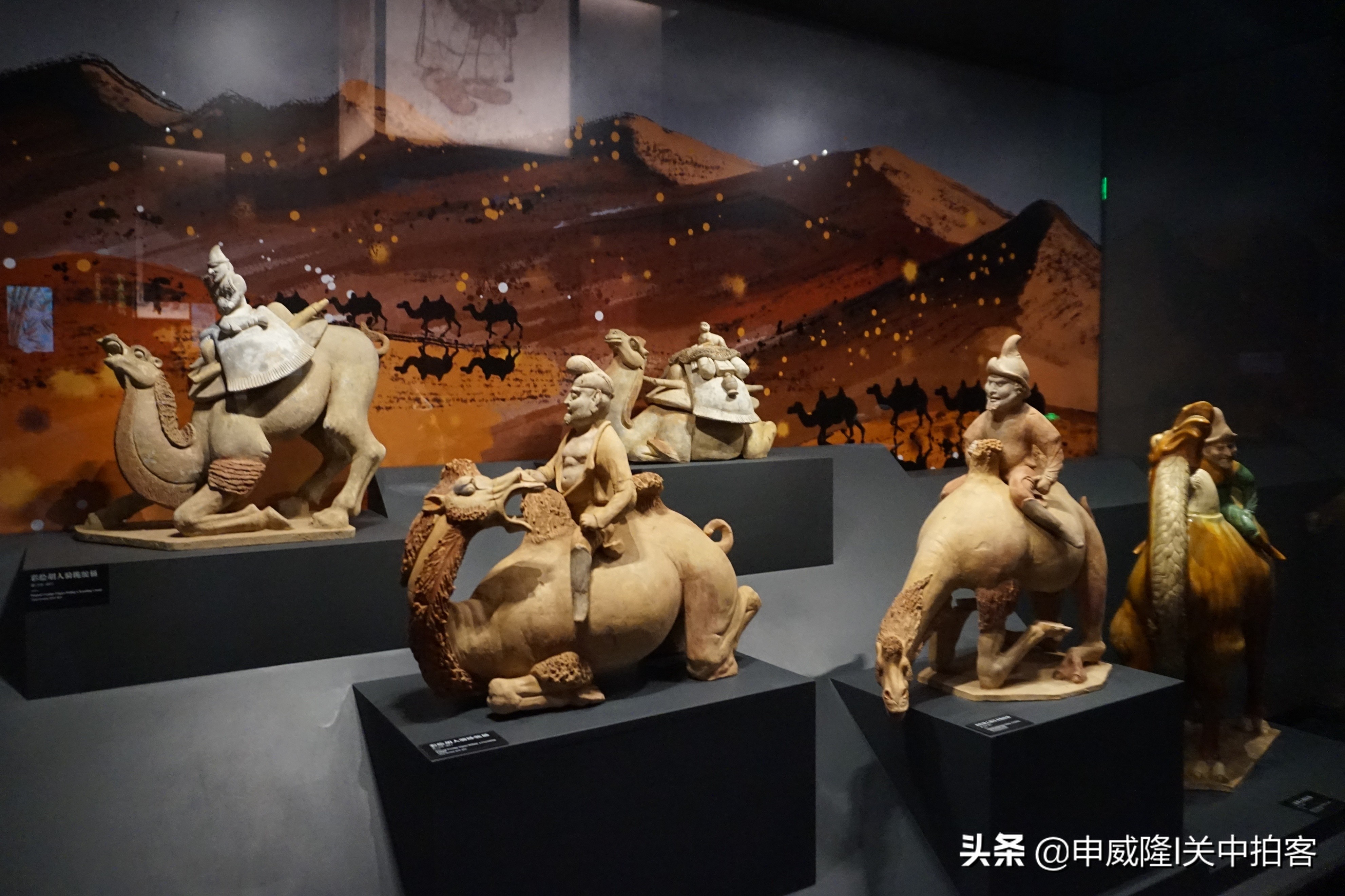 这些骆驼俑可以分为两类,一种是胡人牵着骆驼,一种是胡人骑着骆驼。在骆驼的两个驼峰之间,搭挂着兽面纹饰的驮囊,还有精美的丝绸和水壶等物品。骆驼的姿势各不相同,有卧在地上的,有抬腿要走的,有长途跋涉的。这些骆驼和胡人商贩经过“丝绸之路”的艰辛征途,终于到达繁华的长安城,脸上流露出喜悦的表情。