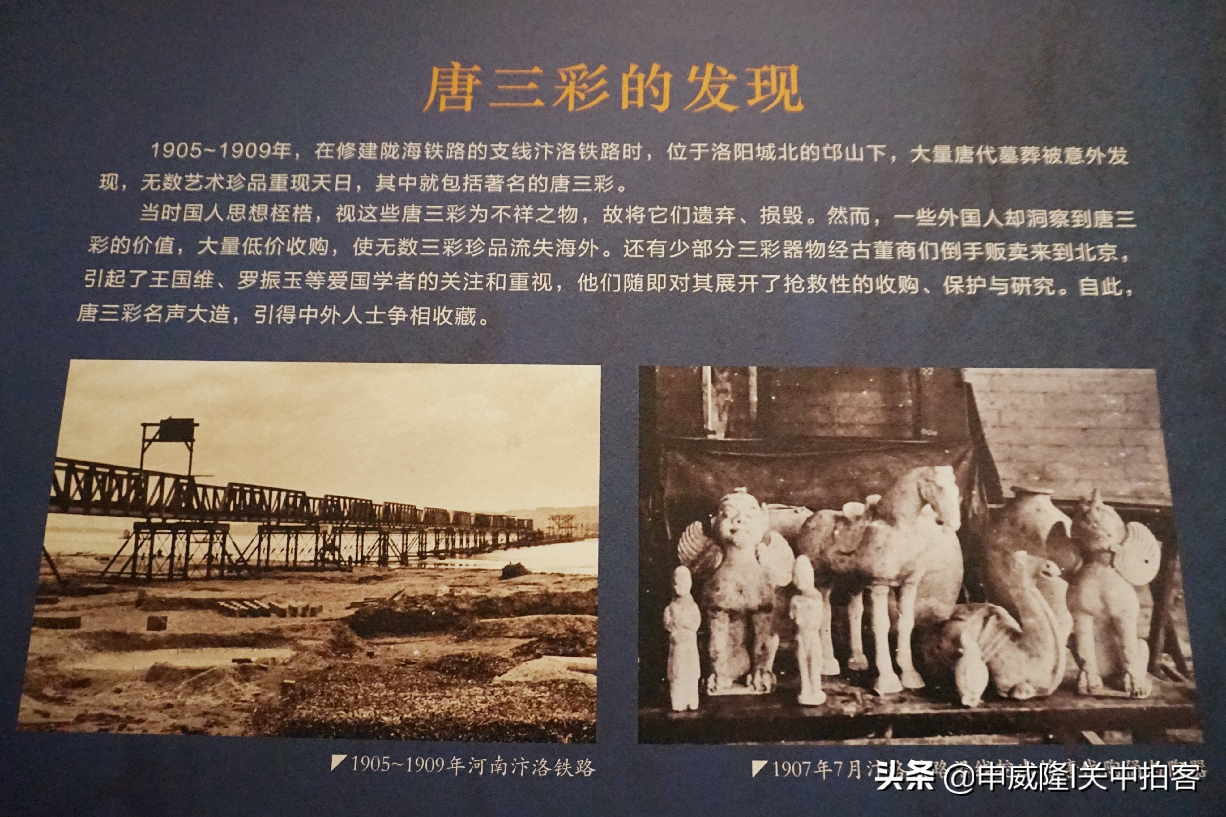 1905年至1909年,修建陇海铁路的支线汴洛铁路时,在洛阳北邙山毁坏一大批唐代墓葬,使得数量众多的唐三彩随葬品重见天日。当时,人们思想落后,认为墓里的东西不好,将这些唐三彩丢弃或者毁坏。但是,外国人意识到唐三彩的价值,在洛阳北邙山进行低价收购,使唐三彩珍品大量流失海外。如今,国家强盛,人民幸福,曾经流失海外的唐三彩不断回到自己的祖国……