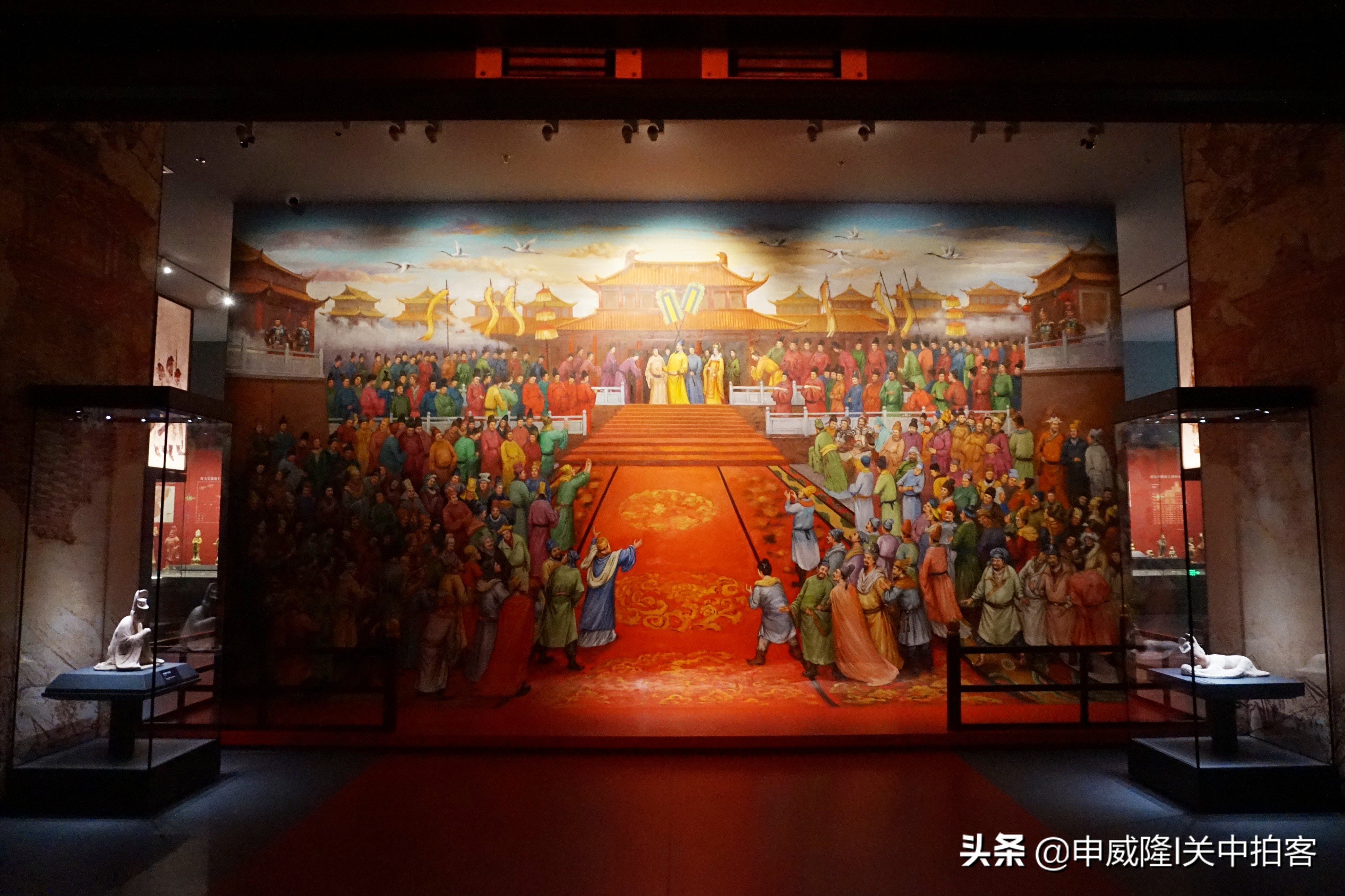 走进后方的展厅,迎面出现一幅巨大的绘画,展示了唐玄宗和杨贵妃在兴庆宫接见文武百官和各国使节的盛大场景。在两侧的展柜中,分别摆放着跪拜俑和伏拜俑,头戴进贤冠,为文官形象。这种姿势属于“九拜”式之一,表达了对帝王的崇敬,也象征对观众的欢迎。