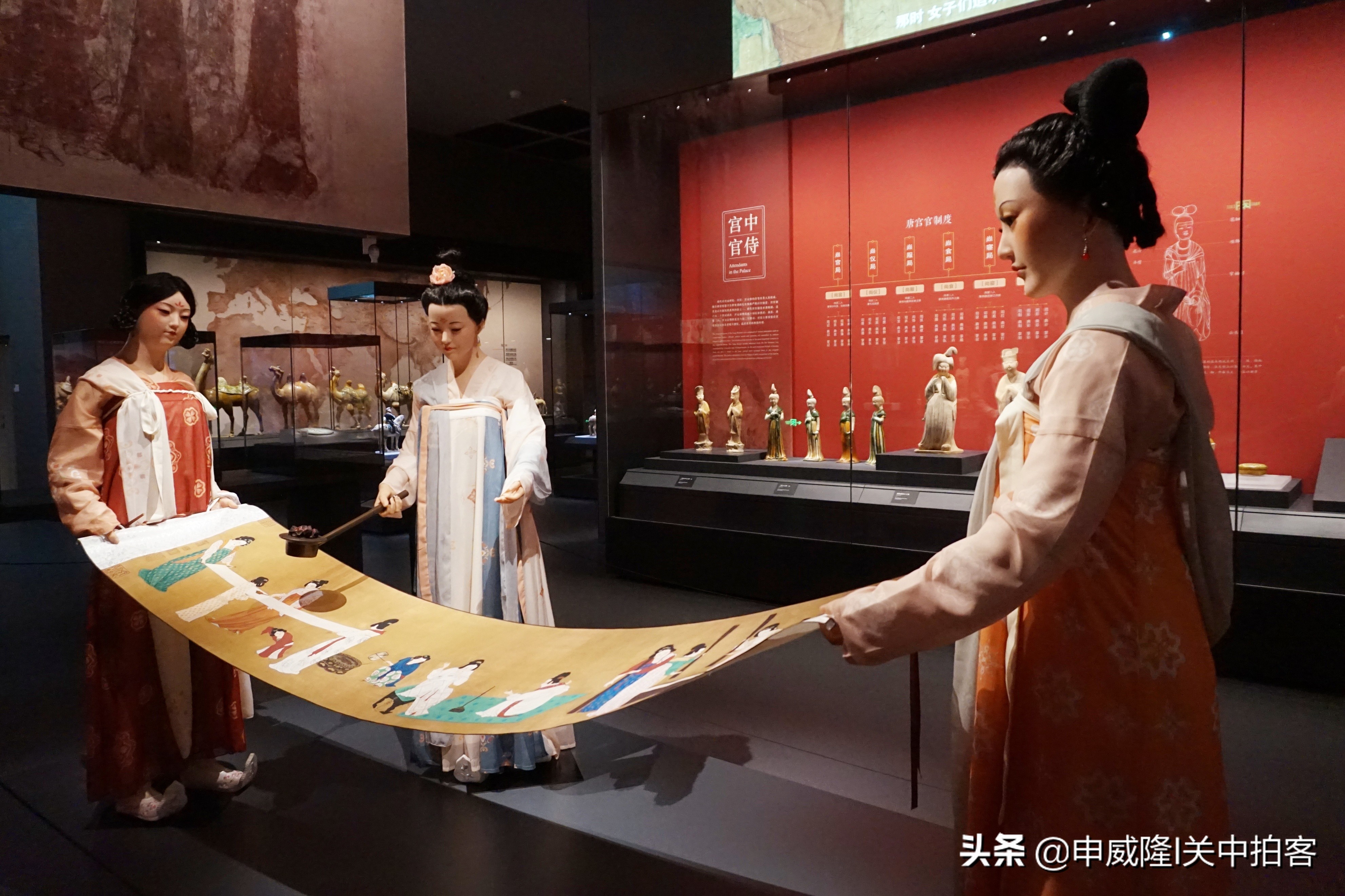 在展厅显眼处,立体复原了唐代画家张萱创作的《捣练图》的场景。两位女子执绢画,一位女子拿熨斗,专注的表情,端丽的仪容,表现出她们温厚从容的心情,跟这里的唐三彩仕女俑相得益彰。