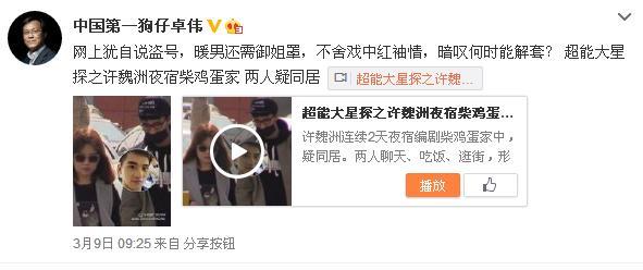 http://si1.go2yd.com:8082/get-image/01r2oHe7kxM号称娱乐圈第一狗仔的卓伟团队总是会带给圈内意想不到的吐血八卦!只是,这一次,许魏洲撞上了他们的枪口。(话说卓伟大人,就不能善待一下刚刚走红的新人嘛,心好累!)