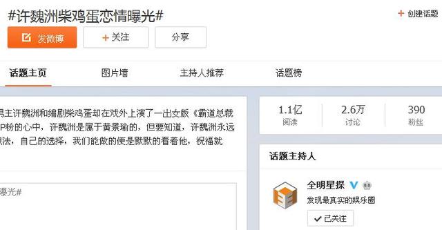 不到24小时,#许魏洲柴鸡蛋恋情曝光#的话题阅读已达1.1亿阅读,真是堪比看大片的节奏啊!