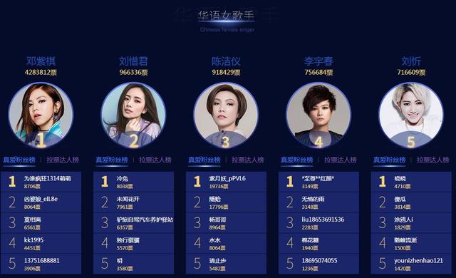华语女歌手(李宇春加油啊,跟邓紫棋的距离有点远,玉米在哪里?)