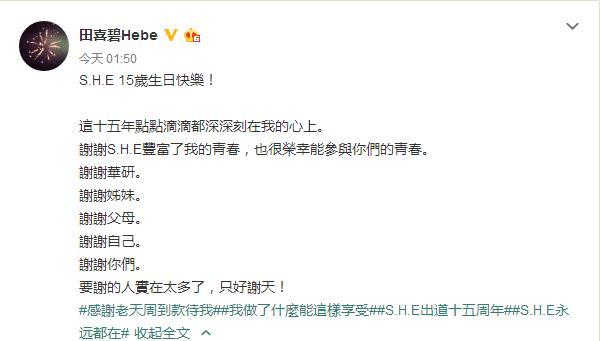 今天凌晨,Hebe就早早的在微博上为自己的团体15岁生日送上祝福,