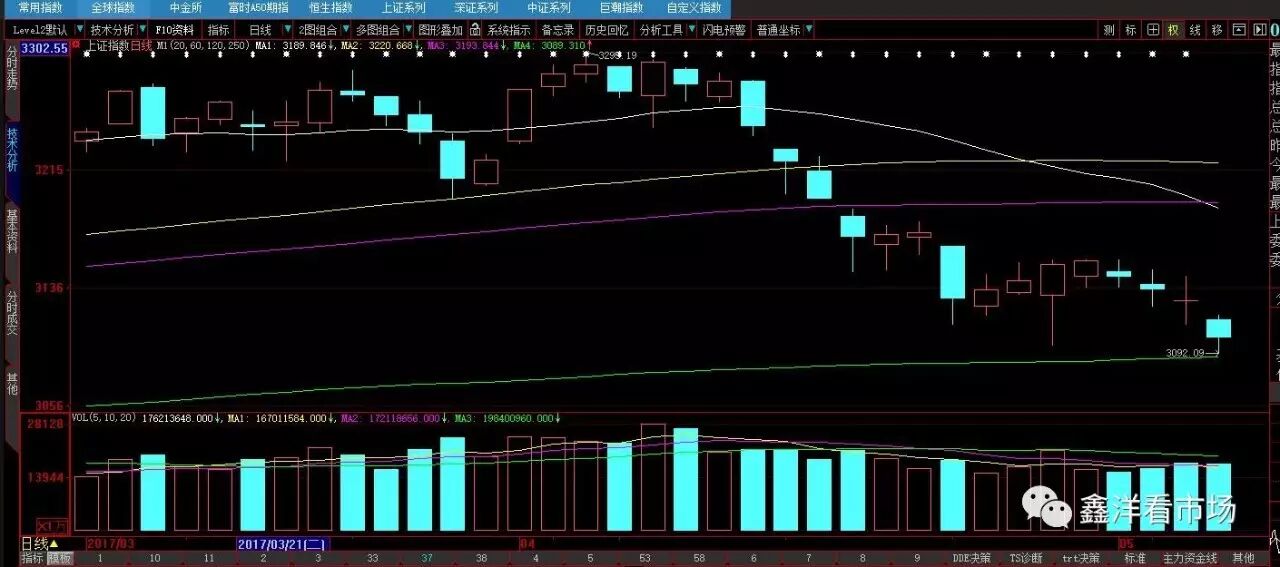 首先我们要分析下3097之下的市场支撑在哪里?只有三处:今年1.16日的3044前低,60周线3073点和年线3089点。一般来说,3044是不允许被跌破的位置,否则3301-3044就成为了大A浪,3044-3295成为大B浪,那么3295开始的大C浪最终目标就可能达到2780-2900一带了(C浪是A浪1.618倍目标2879点,M头目标2787点)。