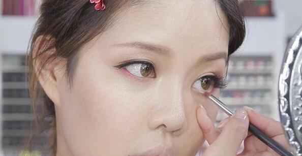 STEP9:用小号眼影刷沾取莓红色眼影,涂满后半部分的下眼线