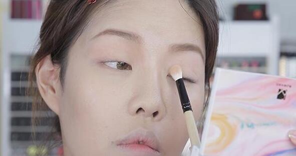 STEP6:眼影刷沾取打底色眼影沿着眼窝轮廓涂抹,再取香槟色眼影覆分别涂在眼窝处还有下眼睑
