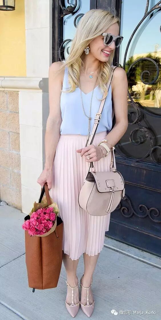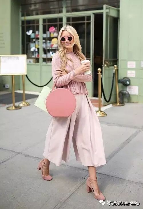 全身粉色绝对是最经典也是最“少女心”的搭配,无论搭配裙装还是阔腿裤,从头到脚的淡山茱萸粉都能让你在一年四季中清丽脱俗~