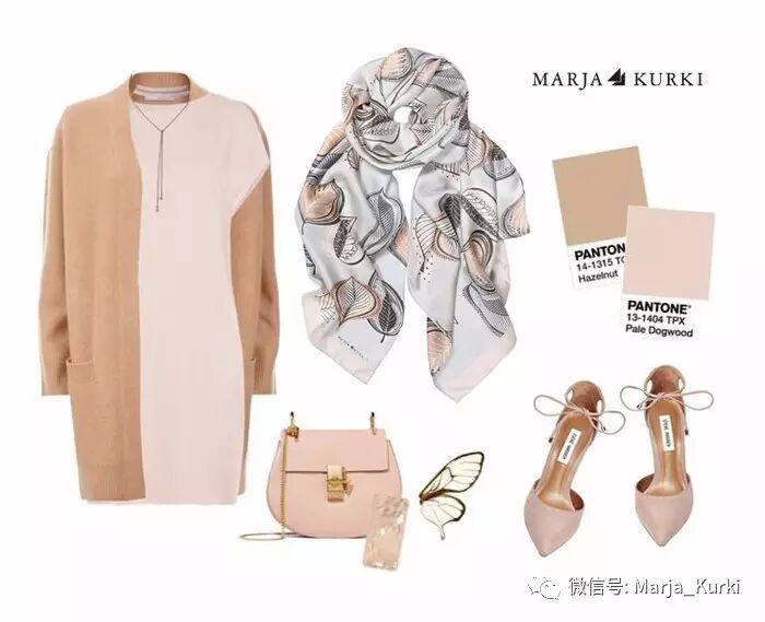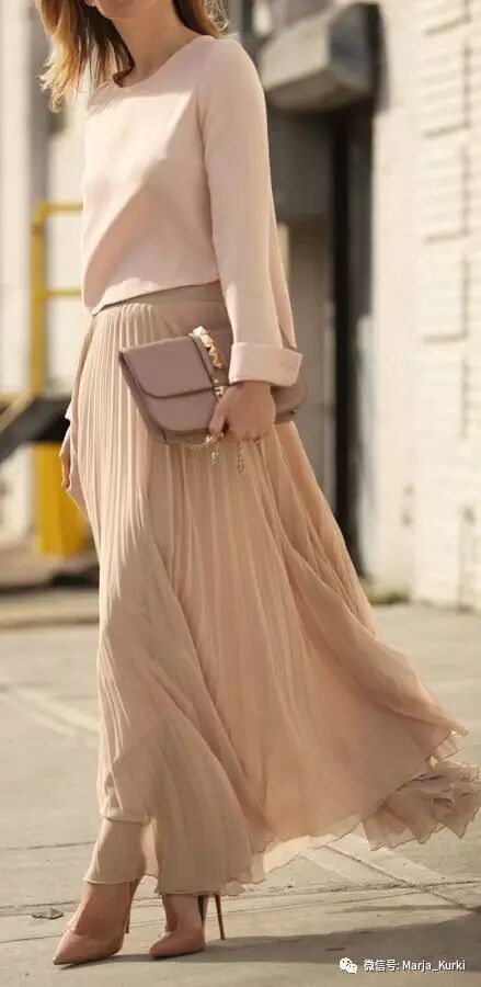 淡山茱萸粉搭配裸色就如同春日里的傍晚,两种温柔的颜色相互融合,丝丝暖意随风流入你的心中。