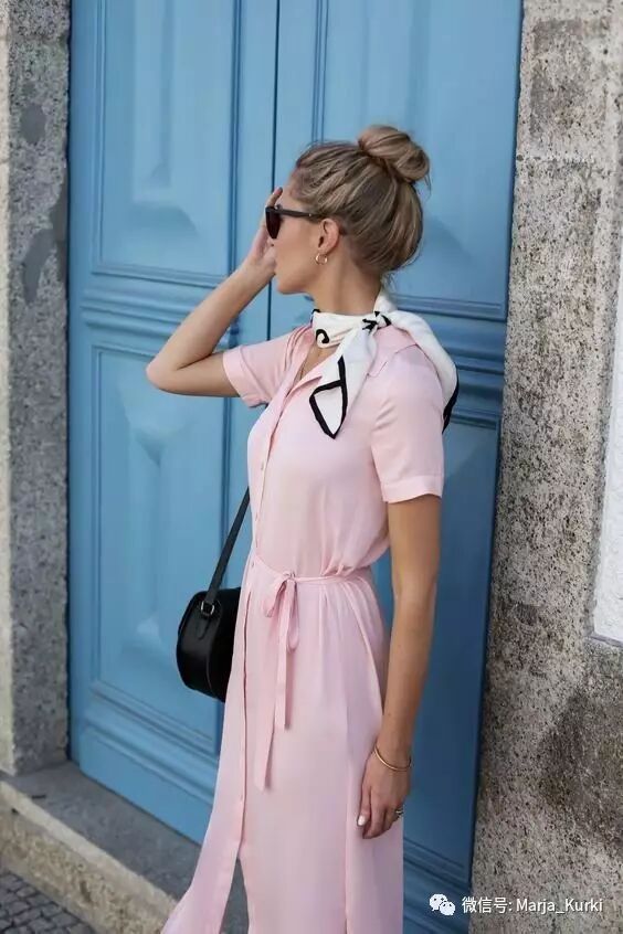 粉色连衣裙搭配白色丝巾自带柔光效果,随时照亮你的美~