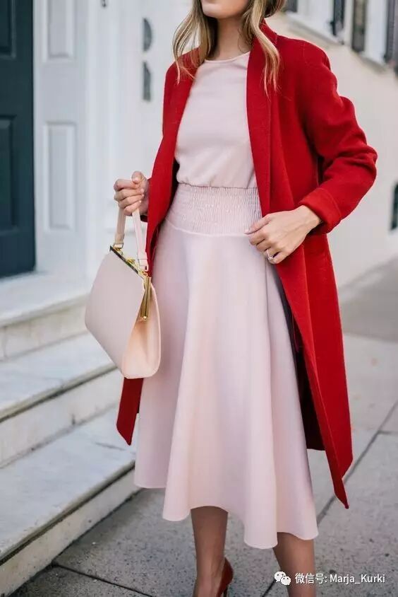 大红色搭配裸粉色,这种新颖配色看似大胆,实则是时装精们百试不厌的“安全”搭配法则。选择偏淡的粉色X红色就是不错的选择,节日尤其适用!