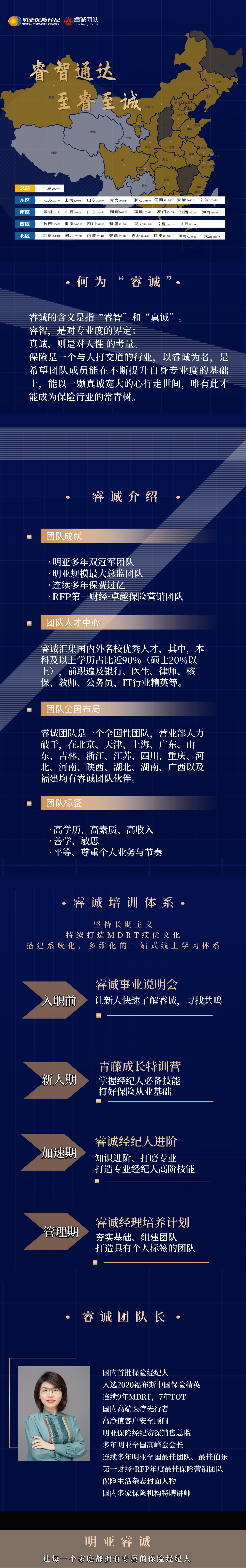 睿诚团队拥有自己独立有效的培训体系,向下分支有近五十人的主管,遍布全国27个分公司,连续三年标保过亿!