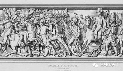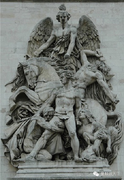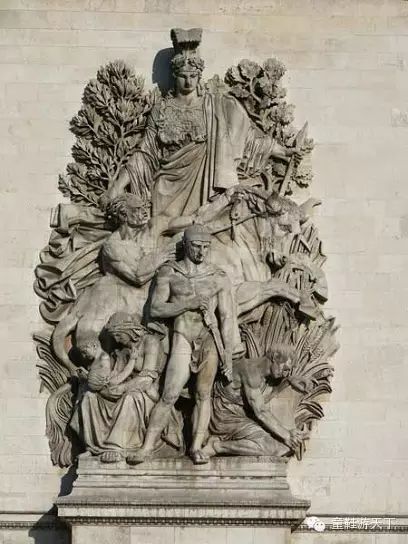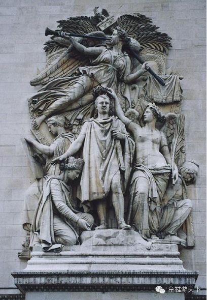 这是雕刻家柯尔托的作品,1810年拿破仑凯旋举行隆重欢庆仪式,胜利女神为他戴上月桂枝花冠,跪者象征敌国城市,后面绑着战俘,女神缪斯在记录拿破仑的功绩,作品上方欢乐女神吹响快乐的乐曲。