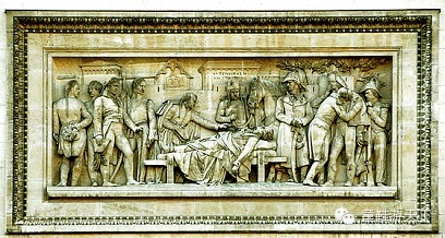 位 于浮雕“出征”上方,老瑟荷的作品,1799年在英军60艘战舰护送下,土耳其军队1.6万人在埃及阿布奇登陆,拿破仑以1万人迎战,法军第一轮进攻无功 而返,战场暂时平静。这时戏剧性一幕出现了,土军司令竟走出掩体,与部下一起割阵亡法军首级,法军愤怒了,不等命令不排阵型冲了出去。一片混战中,龙骑兵 旅长缪拉率1000骑兵从侧翼快速突击,由于攻击得太快,土军尚未反应就被揣了老窝,缪拉手起刀落砍伤土军主帅,法军骑兵横冲直撞,一直将土军全部赶下大海。