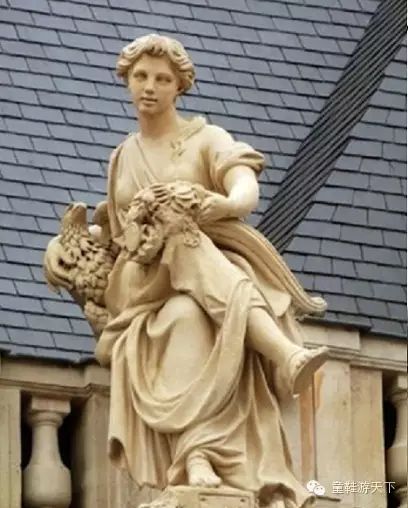 右边是太阳神阿波罗,坐在羊身上,狮子驯服地趴在他脚下。