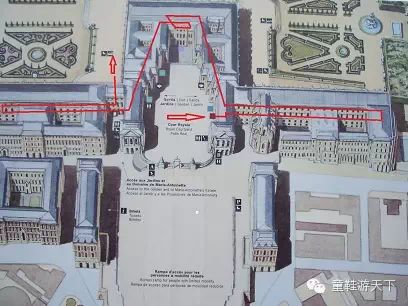 整个宫殿建筑由中部主殿、南翼配殿、北翼配殿组成,这两个配殿是伟大的建筑师蒙萨1672-1684年设计扩建的,参观线路用红线标识如下,先进入北翼配殿,然后是中部主殿,再到南翼配殿,最后进入大花园:
