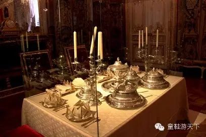 这 里常举行盛大排场的公开用餐,只有皇室成员可以上桌,一般就是皇帝夫妇、皇子、公主、公爵夫人之类,观摩者包括享有特权使用脚凳的贵族,还有满满站着的人 群,众目睽睽之下用餐不知道是一种怎样的心情?路易十四对此很享受,几乎每晚要举行这种活动;路易十五却喜欢私人用餐;路易十六经常吃得津津有味,而皇后 甚至连手套也没脱,完全没心情用餐,为避免气氛尴尬,这里安排了乐师伴奏。