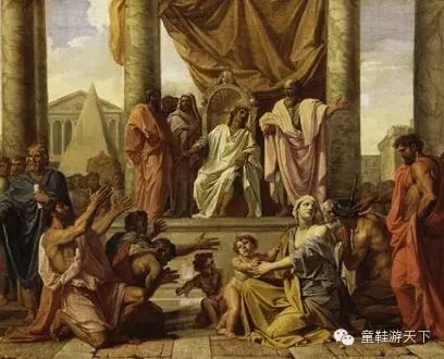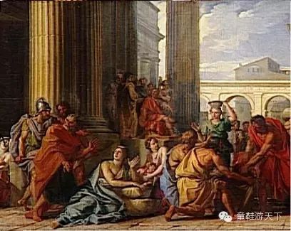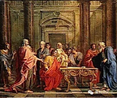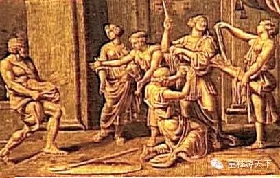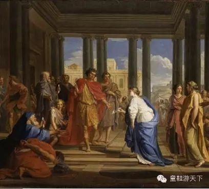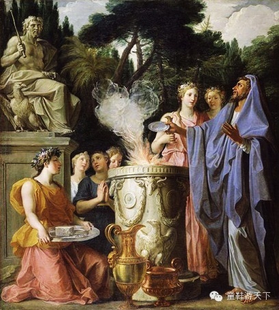 古罗马人极为重视对朱庇特的祭祀,画面左上方朱庇特手持权杖接受祭祀,旁边站着一只鹰。按规定祭司由男性贵族担任,祭祀过程不能自己走路,所以画面中祭司没穿鞋,女性在为祭司递送祭品。