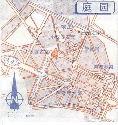特里亚农宫(图上称翠安农宫)在大花园的西北处,这里是宫廷的别墅,很安静。