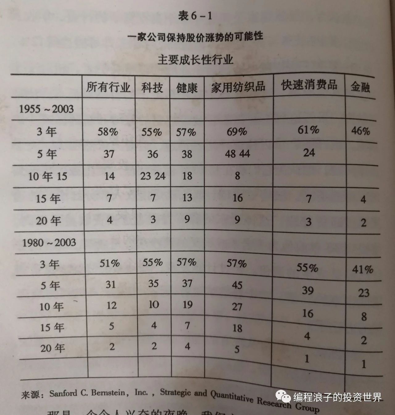 如上图,他统计了1955年以来,美国的各主要成长行业中的公司一直持续保持涨势的可能性。我们可以看到,从1955年到2003年,对于美国所有的行业,经过3年,一家公司还能继续保持涨势,也就是还能继续创新高的概率只有58%,换句话说,三年之后,只有58%的公司能让其所有投资者都赚钱。经过5年,这样能让所有投资者赚钱的公司只剩下37%,而经过10年则只剩下14%,也意味,着,我们投资10家公司保持不动,10年之后,其中9家公司将衰败,只有1家公司存活可以继续为我们赚钱。而经过15年,这个数字将变为7%,20年这个数字只剩下可怜的4%。而从1980年以来的数据,可能由于上市的公司增多,滥竽充数的比例也在升高,这个数字变得更惨了,从3年到20年不同周期,这个数字分别降低了7到2个百分点不等,10年这个数字降低为12%,20年这个数字更是只剩下极其悲惨的2%,也就是投资50家公司最后能保持20年长青的公司只有1家。如果选10家企业,只剩下0.2家,四舍五入等于0--也就是--渣都不剩。