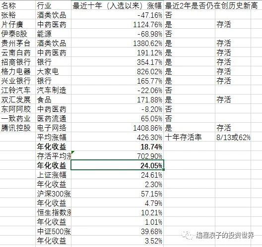 再从本文主题存活率考量,这13家公司由8家达到存活标准,存活率为62%,远远超过上述表格同周期统计的14%和12%(当然这个统计是美国的公司,我没有统计咱们中国的公司,从但上述各大指数的表现看,我觉得似乎也没有统计的必要了,懒得做了,以后有兴趣再说,总之不会比美国公司好到哪里去,甚至更差)。而这些存活的公司总体平均收益达到702.90%,也就是翻了8倍,年化24.05%。也就可以认为说,当我们不维护我们的R15组合,无脑拿10年,我们的年化收益率可能逐渐从24.05%降到最终的18.74%,而如果中间我们持续维护(因为10年时间足够长,我们有充足的时间进行持续的研究和缓慢更新),逐渐及时用新的R15替换掉不存活衰败的公司,那么这十年我们收益将大概率高于保底的18.74%,无限接近于24.05%,甚至或左或右,因为也可能新入的公司表现更好。当然对于我们很多热爱投资的投资者,每天泡在雪球上,不可能不维护,所以有理由相信在这个组合基础上可以进一步提高这个存活率。(实际上,我每年都在对这个组合进行维护更新,可参见系列博文《总结进行时:2019年R15和双五股票表现大盘点》)