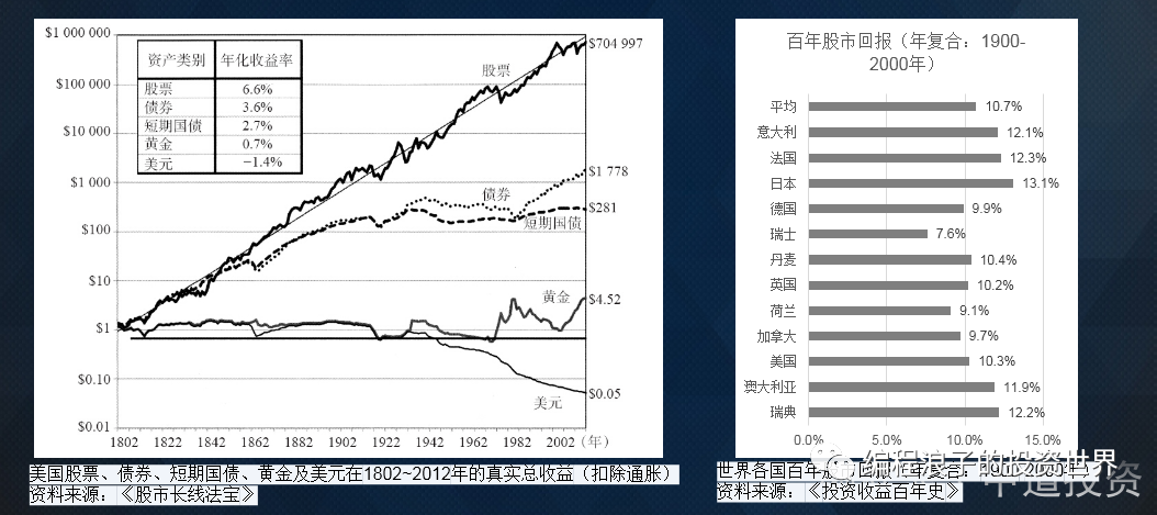 综上,在世界范围内,从资本主义股份制建立以来,无论是从历史的回溯证明,还是未来的展望预期,股票作为一个大类资产,长期始终是一个最好的资产,在过去历史长河中,知道坚信这一点并长期付诸行动的人都获得了巨大的甚至匪夷所思的回报。总之,鉴于距离终极贡献者太阳熄灭时间还早(据说还能燃烧40亿年),只要人类不出现巨大内讧(核能时代以来,大的内讧概率已经降到极低),未来无论30年,50年还是100年,我始终坚信股票将是最好的一个大类资产,尤其是当下的中国,更是如此(因为中国人的智力和勤奋,代表了地球潜在即将释放的新财富的最活跃部分,缺少的只是和平,而现在这似乎也已经有了一定的坚实的保障,如果不算上近期非人类的威胁的话,我们还是有理由乐观的)。
