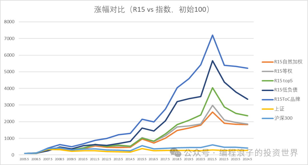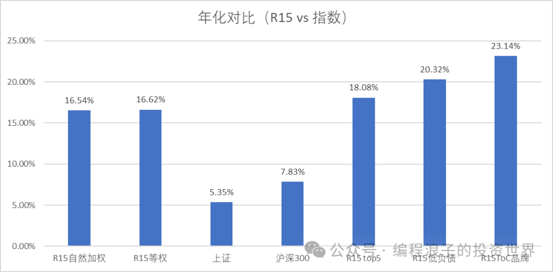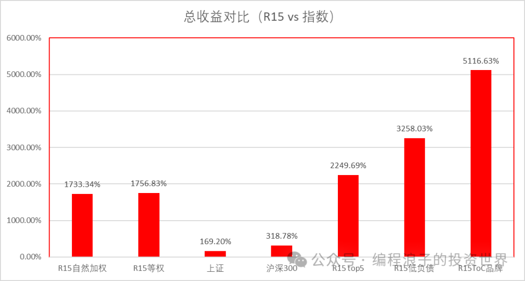 五一最新一期R15排行榜发文之后,又有很多小伙伴私信要R15的历史收益,这个我其实每年都在做,也在QQ群部落分享过,在两年前也公开发布过一期(参见《R15排行榜Top10历年收益(2022)》),今天再次把历年收益曲线更新一起发给大家。注意这是过去R15的收益(R15排行榜本来就是对过去的排名),具有客观性,可以完整回溯呈现给大家。而未来R15因为选股具有主观性和定性考虑,因人而异,所以就不好发了,只把2010年底选的那批在早年博客(10年前)有公布,可以稍微参考一下。