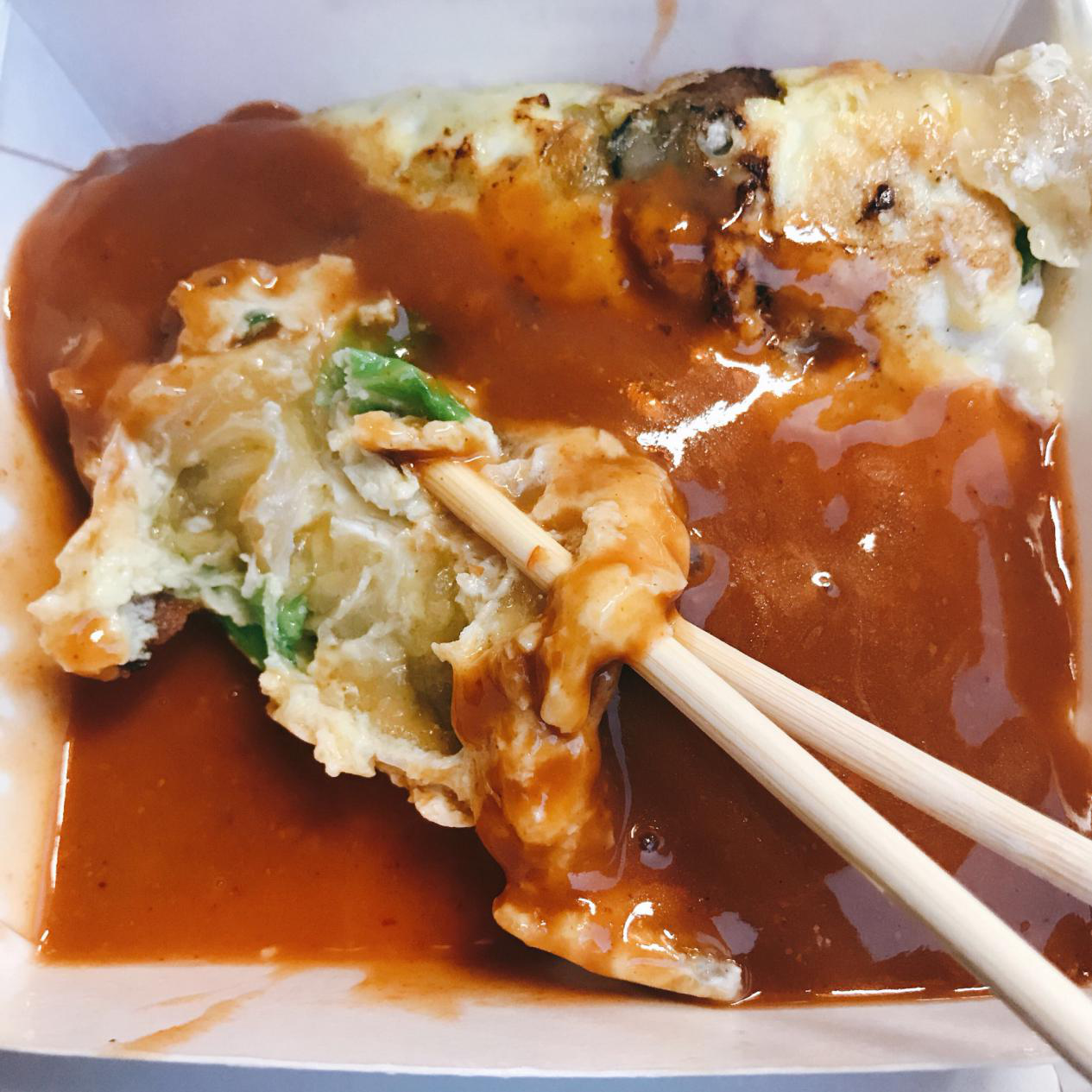 新鲜甜美的海蛎混着浓稠的番薯粉,最后撒上一把绿油油的葱花和红艳艳的胡萝卜丝,可谓是色香味俱全。