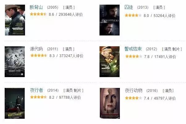 来看看杰哈近些年的作品:《断背山》《源代码》《警戒结束》《囚徒》《夜行者》《夜行动物》……豆瓣平均分大概维持在8分左右,都是口碑上乘的作品。
