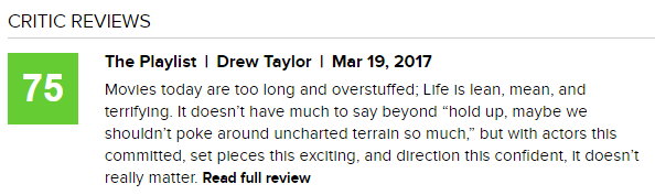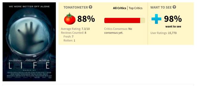 从烂番茄评分来看,大多描述本片和《异形》有着相似的故事线,却仍然精美、惊吓和刺激,且具有感染力,以至于很多时候会忘记本片在某些故事情节和《异形》是共有的。
