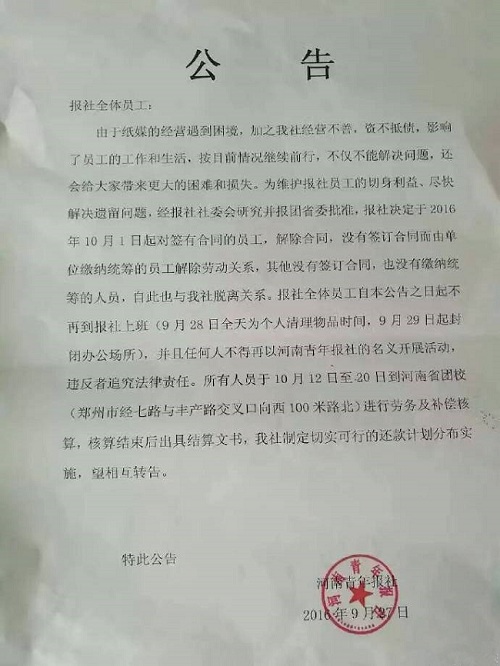 公告称,因纸媒经营困境及报社资不抵债,《河南青年报》宣布停刊。