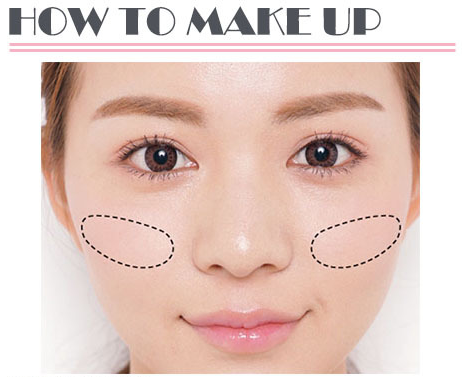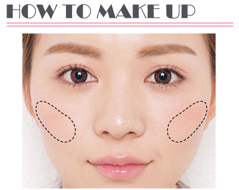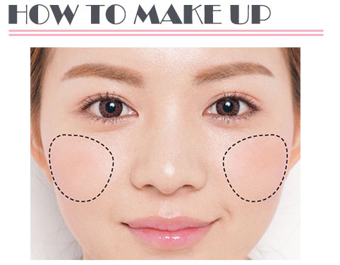 脸型较圆的 MM 可以用斜线增加脸部的修长感,将腮红以斜向的画法,从靠发际线的一侧出发,由颧骨往脸中央刷,打造脸部角度。