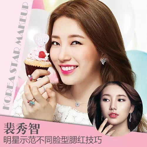 来看看秀智,秀智的脸蛋稍稍有点圆,正面会比较明显地可以觉得她离椭圆鹅蛋脸就差那么一点了!侧面可以看到,秀智的腮红打在了苹果肌偏下、颧骨到发际线的位置斜向上,橘红色比较明显,显得甜美。