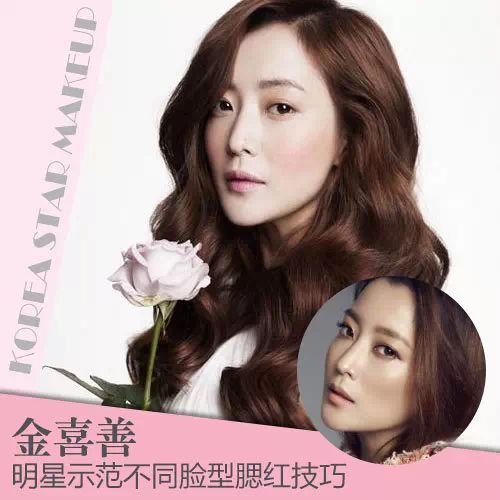 最后来说说颧骨较高的脸型。金喜善是其中一个比较典型的例子,正宗尖尖瓜子脸的 MM 很多都会有颧骨太高这个烦恼。颧骨太高会显得比较刻薄,金喜善小姐为我们展现了两种 Style,一种是使用米色系腮红搭配高光,立体感明显,将刚 ( ke ) 强 ( bo ) 进行到底 ; 另一种是用粉橘色的腮红打在颧骨下面缔造柔和感,你觉得哪种 Style 更适合 ?