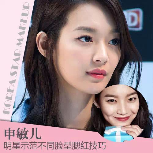 申敏儿的脸蛋有点宽,最明显的是脸颊,苹果肌明显地鼓起。从两个造型中,可以看到申敏儿的腮红都以圈圈的样式打在苹果肌上面,颜色没有太明显。