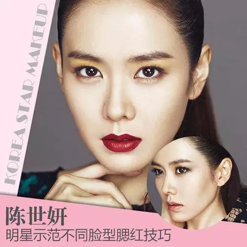 陈世妍同样是颧骨有点高,可以看她的一套写真中,用的就是深褐色的腮红,用量不多,颜色比较明显,在脸颊大部分位置用高光,视觉上移走了颧骨的刻薄感。