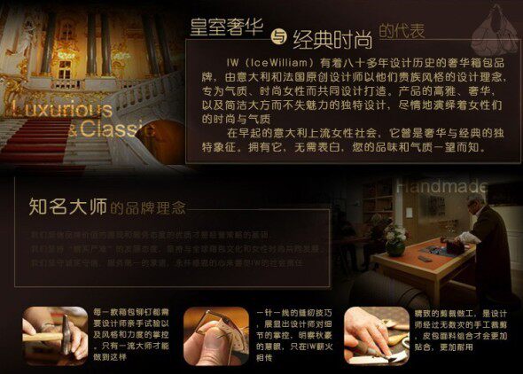 此图就是一个案例,一眼瞟过能知道店铺的高档奢华风格。但缺少的是品牌的植入(品牌LOGO没有。),产品的款式主打(客户不知道你卖钱包还是卖真皮女包还是卖时尚的款式)。英文的奢华经典,估计没有几个人看的懂,所以想要植入啥,千万别玩文字游戏,消费者不会去钻研,估计连看都懒得看。