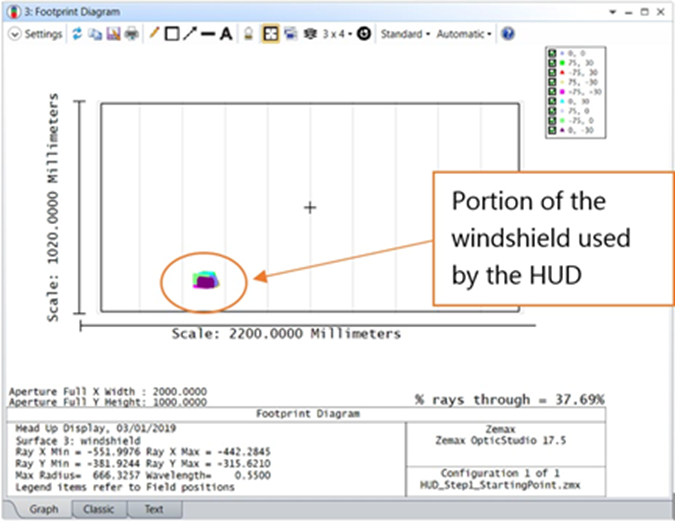 为了找到这个“有效”区域,可以使用光迹图(Footprint Diagram)工具,该工具可以在分析菜单栏下的光线迹点(Rays & Spots)中找到。它显示了光束在挡风玻璃表面上叠加的光迹: