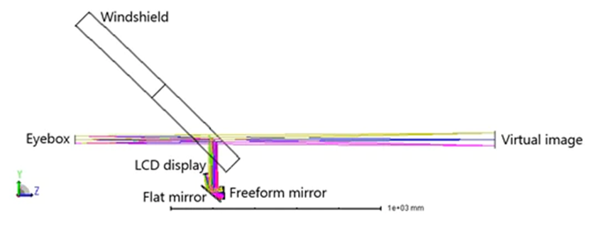 从虚像到显示器:设计是在序列模式下反向进行的。为什么呢?因为从驾驶员看到的虚像开始模拟很方便。这样就可以将光阑面放置在系统前方,即视窗所在的位置。在光阑面放置矩形孔径以表述对眼睛位置的约束。