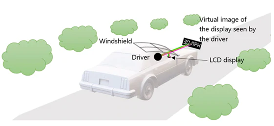 下面是 HUD 的简图。液晶显示器(LCD)会发光,这些光被构成 HUD 的两个镜子反射,然后再被挡风玻璃反射,最后进入驾驶员的眼睛。驾驶员看到的是位于道路上的虚像,该虚像为驾驶员提供例如速度等信息。