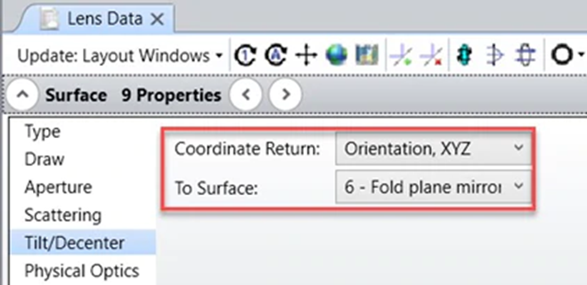 坐标断点返回:坐标断点面可以使用表面属性下的倾斜/偏心中的坐标返回来定义。OpticStudio 之后将计算该坐标断点面的参数,以便在该坐标断点面之后,局部坐标(“返回”至)与之前的序列面型的局部坐标相同。