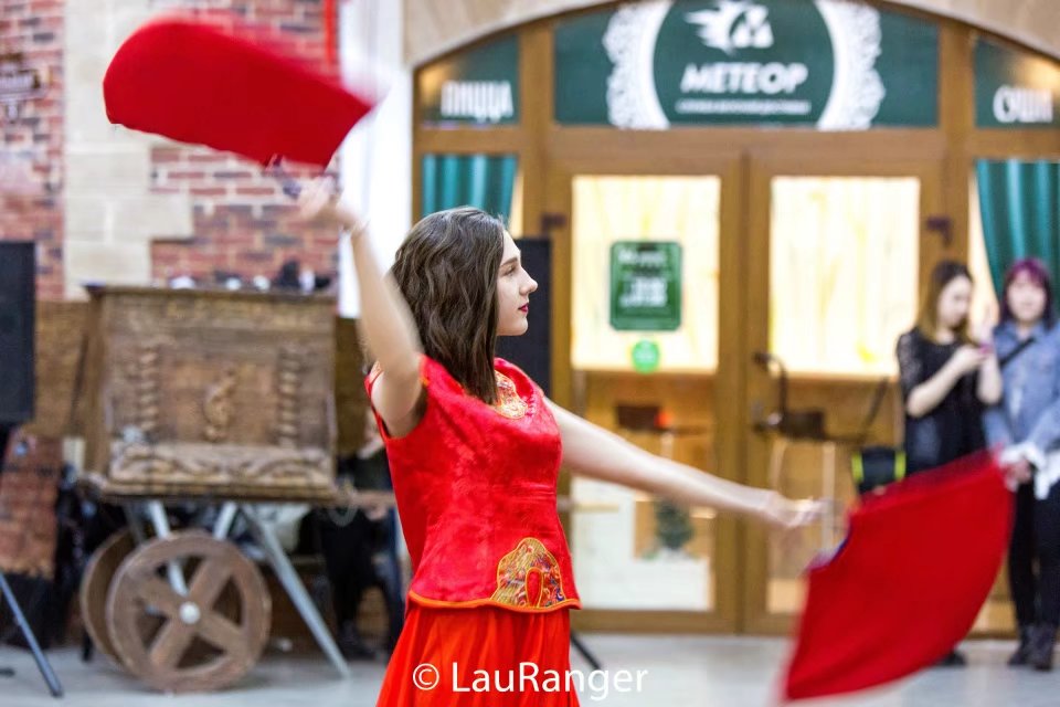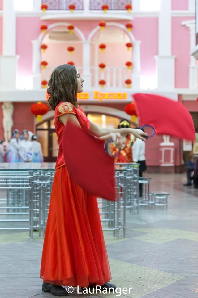 在群岛广场中心舞台,中俄艺术家联袂登台献艺,把祝福化作一曲曲欢歌,一支支热舞。琵琶独奏《渔舟唱晚》,独唱《我的歌声里》,传统舞蹈《长水袖舞》点燃现场气氛,在俄罗斯民众中刮起强劲中国风。50名身着中国红的俄罗斯中老年扭起了欢快的秧歌;美丽的俄罗斯姑娘手执彩扇,在中国传统曲调中翩然起舞。喜庆的节日气氛从台上延伸至台下,在一片沸腾的中国红中,中俄儿童身着中国节日盛装,手捧元宝、身挎福袋,化身友谊小使者,把最真挚的祝福送给每个过往的中俄民众。
