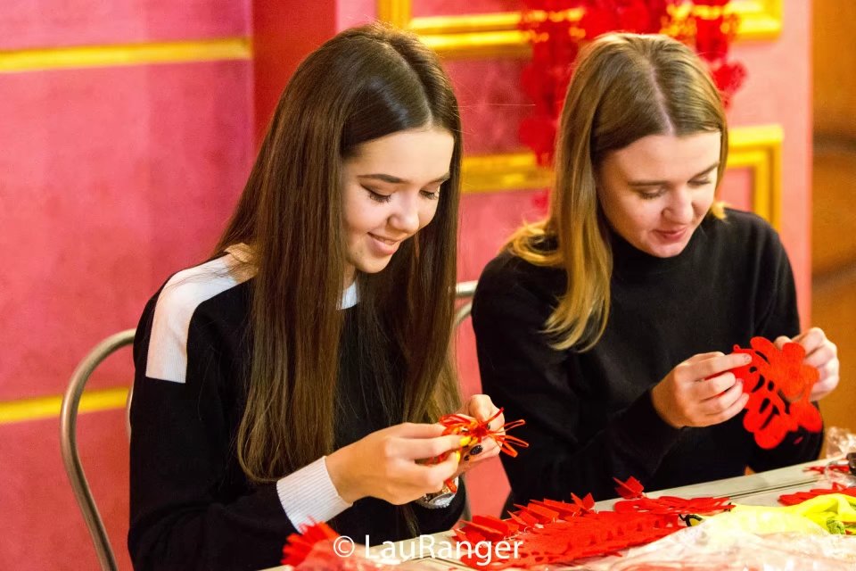 “小孩儿小孩儿你别馋,过了腊八就是年儿……” 精美的剪纸动图,喜庆的卡通形象,欢快的背景音乐,随着介绍中国文化的《福旺中国年》小视频在大屏幕前滚动播放,活动现场的民俗体验区人满为患。来自布拉戈维申斯克市孔子学院的中俄师生身着唐装汉服、精美旗袍亲自演示并手把手传授中国文化,传统乐器的吹弹演奏,典雅精致的茶艺表演,惟妙惟肖的脸谱制作,古韵古调吸引了大批俄罗斯民众驻足体验,他们纷纷参与到写福字、画年画、剪窗花、品茶香当中,一丝不苟的制作民俗饰品,体验中国文化。