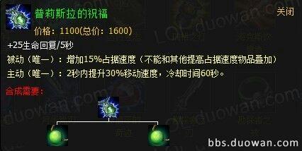 普利斯拉的祝福( Priscilla's Blessing)售价:1600G(合成价格1100G)属性:回复25点生命/5秒唯一被动:增加15%据点占据速度(不与其他增加据点占据速度的装备叠加)唯一主动:在2秒内增加60%的移动速度,60秒CD已移除(这装备除了炼金我想不到谁能出了